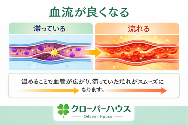 温熱により血管が拡張し体を深部から温めることで、滞っていた流れが老廃物の排出を促します。