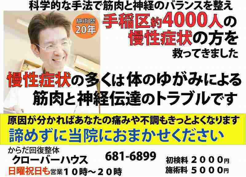 手稲で20年、紹介・口コミが8割の信頼でつながる整体。原因を治すから慢性症状に強い。困ったときこそお越しください!絶対後悔させません!目指せ地域ナンバーワン