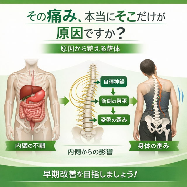 多くの方は、痛みや不調がある場所に原因があると思われています。ですが、実際には、身体はすべてつながっており、本当の原因が別の場所にあるケースは少なくありません。特に内臓の疲れや働きの低下は、自律神経を通じて筋肉の緊張を引き起こし、結果として姿勢のゆがみや慢性症状へとつながっていきます。